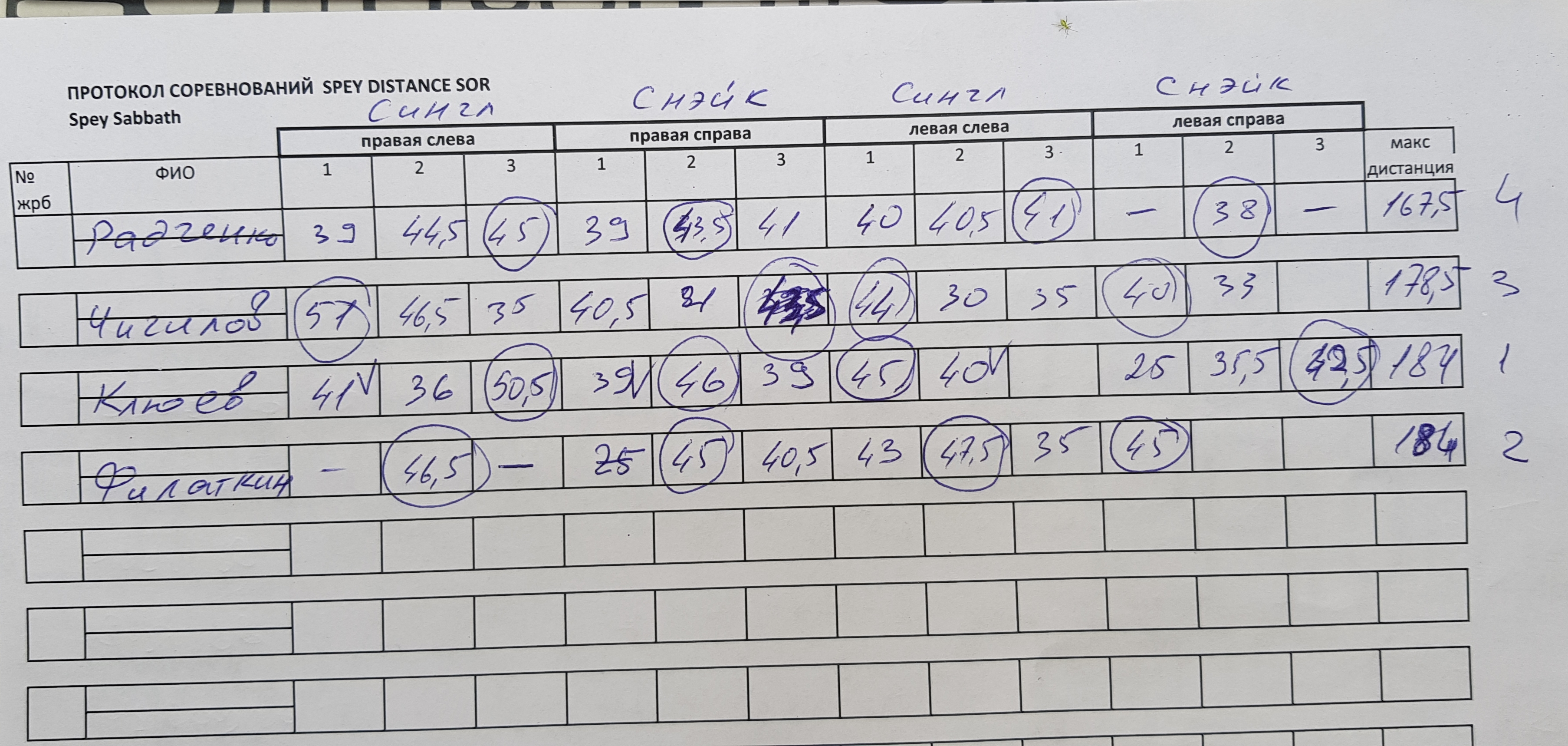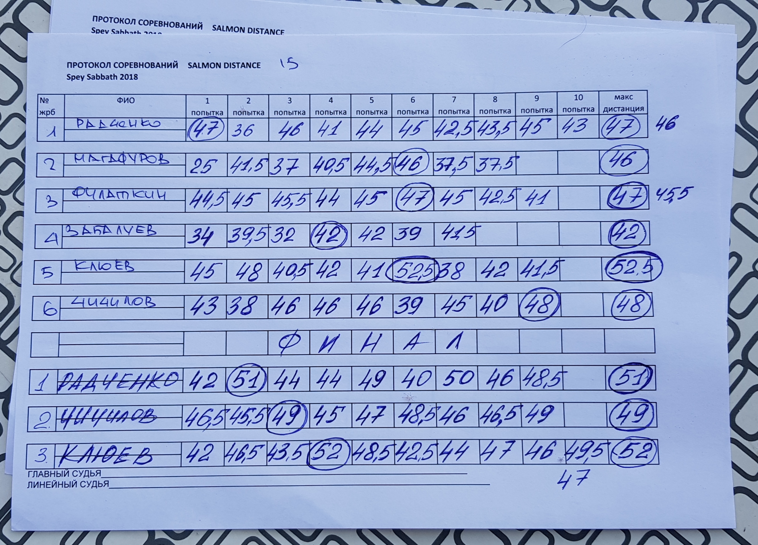 В финале мои «минусы» проявилось особенно явно, забросы вымученные. И даже если бы крайний левый снейк на дистанции 46м не приземлился в микроскопический аут, я бы все равно остался на четвертом месте. В своей любимой и главной дисциплине победил Сергей Клюев, опередив красиво и стабильно кидавшего Андрея Филаткина по сумме вторых забросов (у Андрея по двум видам забросов только по одной зачетной попытке). У Артема Чичилова возникли сложности с левым снейком. Но еще повлияло и нечеткое судейство — записывавший результаты судья ошибался по количеству выполненных/оставшихся попыток у Артема, что явно помешало кастеру показать свои лучшие результаты. Обязательно необходимо, чтобы при проведении этой дисциплины рядом с записывающим результаты судьей находился еще один судья, занятый только контролем вида заброса. В итоге, подиум Spey Distance 15 (SOR) таков: