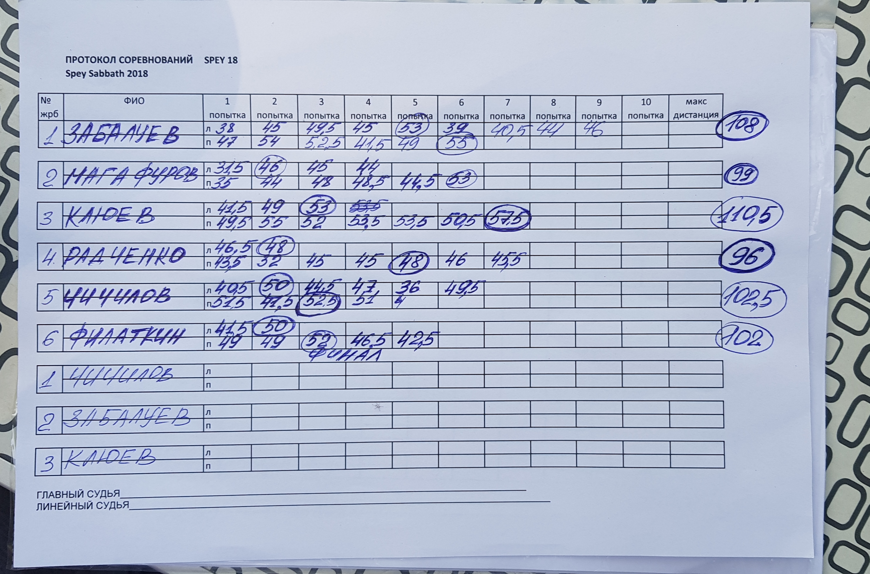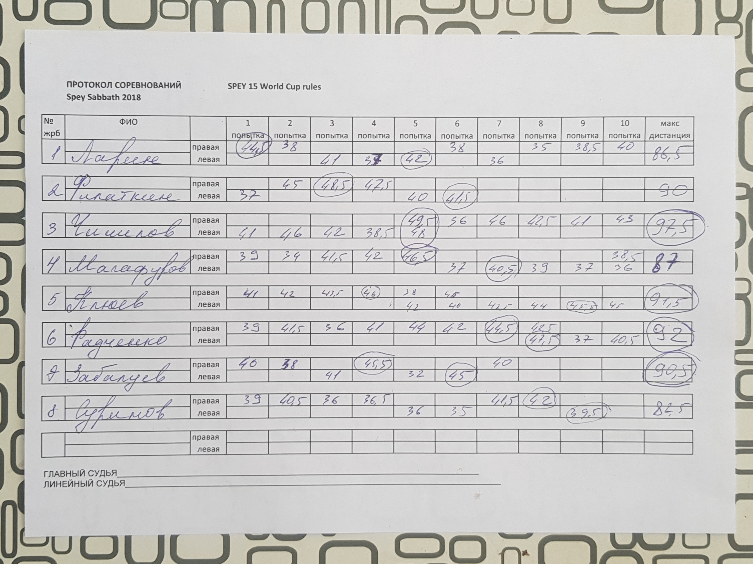 К финалу Спей-18 Артем подошел в пике формы — первое место! Сергей Клюев приехал на соревнования простуженым, к финалу Спей-18 это начало влить на чистоту его забросов. К концу квалификации Спей-18 и так не сильно помогавший кастерам ветерок стал стихать. Практически штиль в финале дисциплины, что заметно по снизившимся результатам финалистов в сравнении с квалификацией. Подиум Spey Distance 18: