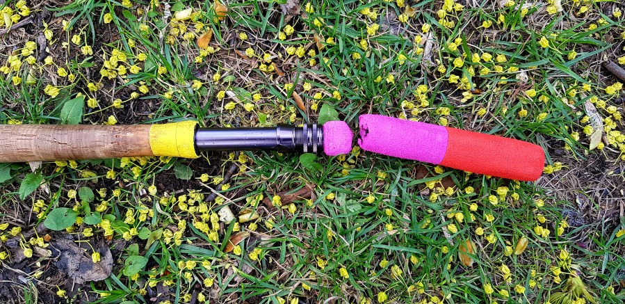 — А что же это за рукоять такая чудная? — спросите вы. А дело в том, что переделывал я серийную палку КС STR #9 10’0″ — отрезал вершинку и наращивал бат. Чтобы сделать помощнее. И вставку сзади вклеил излишне тонкостенную. Несколько тренировок и квалификацию пережила, а на мощном бэке в финале с веселым хрустом отломилась. Произошло это приблизительно в середине моего финального интервала (всего в этой дисциплине на выступление отводится 4 минуты). Правила предусмотрена остановка для замены снасти в случае поломки. Но я решил не устраивать суету и докидать «хромой» удочкой, тем более что как-то «не летело» у меня. Забегаю сильно вперед — в дальнейшем не планирую поступать так небрежно и буду стараться использовать все шансы. Желтый, красный и фуксия в рукояти — обточенные ЕВА из детского конструктора. Тоже был эксперимент, и тоже неудачный — материал излишне мягкий и плохо поддается механической обработке.