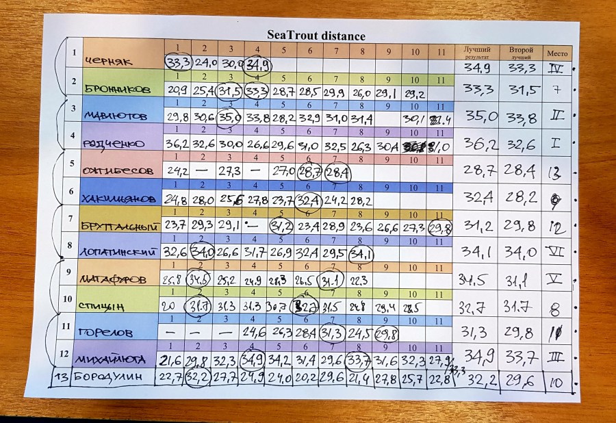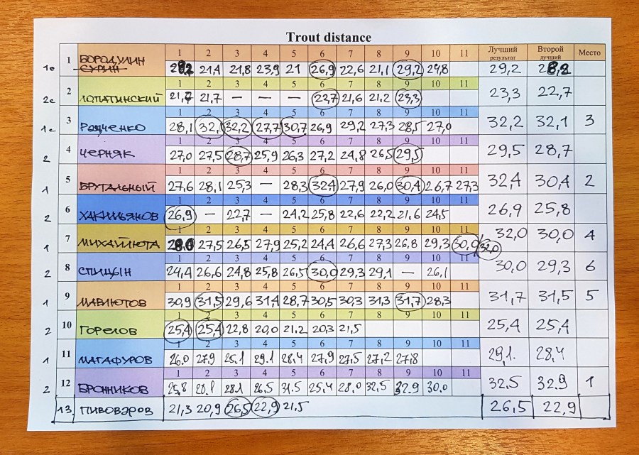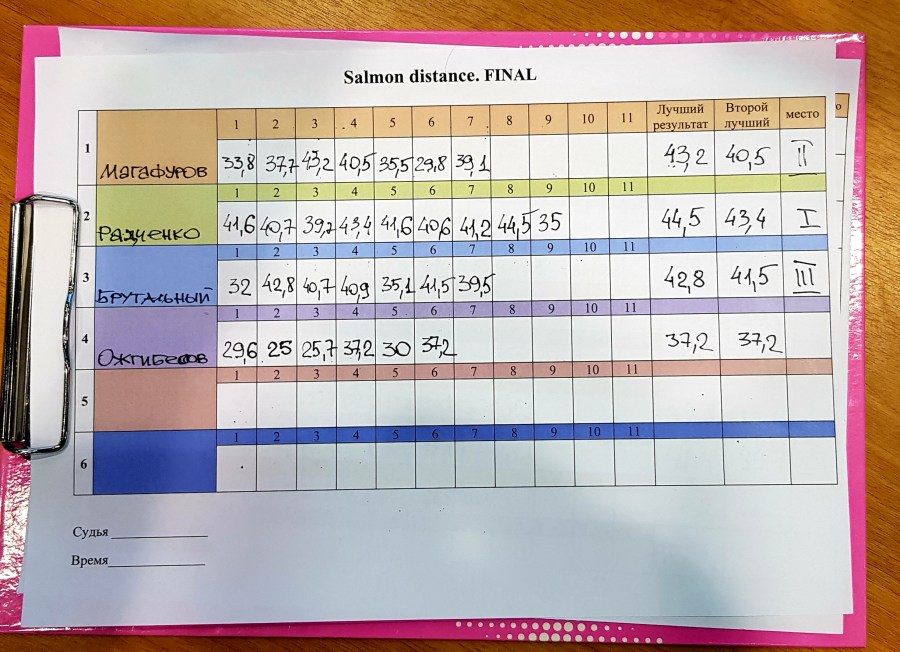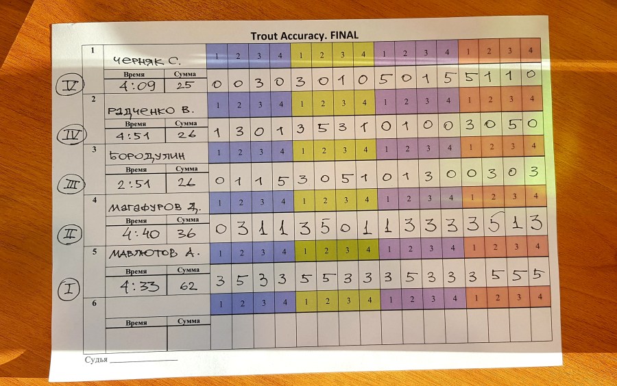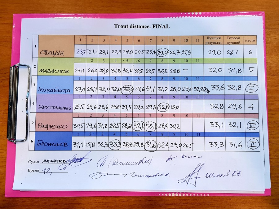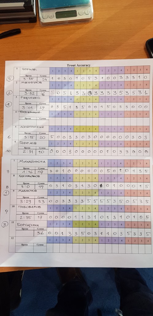 В финале набрал 26 очков и уступил третьему месту по времени. В этой дисциплине при равенстве очков приоритете имеет тот, кто быстрее выполнил упражнение. Так как ставил себе задачу в финале выступить поспокойнее и использовать побольше времени (получилось 4’51»), то не расстроился. Опыт получен, тайминг в боевых условиях отработан. И еще пара важных моментов для отработки (собственные наблюдения и подсказки Анвара Мавлютова, победившего в этой дисциплине с огромным отрывом от конкурентов): не использовать тягу в розыгрыше, четче следить за отклонением мухи по ширине. При определении дальности дистанции учесть казалось бы очевидный момент — в самом забросе рука с удочкой проходит более длинную дистанцию, что приводит к перебросу центра мишени по длине. И здесь, и в Новосибирске обращал внимание на то что перебрасываю, вот теперь стала понятна причина.