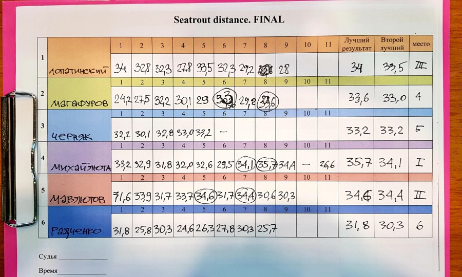 В финале у меня был заброс с которым, скорее всего, я бы победил — запутался раннинг и застрял в кольцах, пушистик при этом лег на 32.1м. В итоге — третье место и надежда отыграться в Ситраут. Пошла квалификация Seatrout Distance: