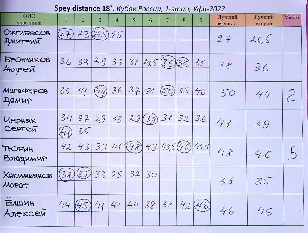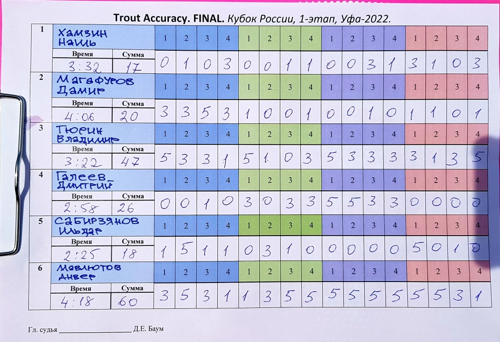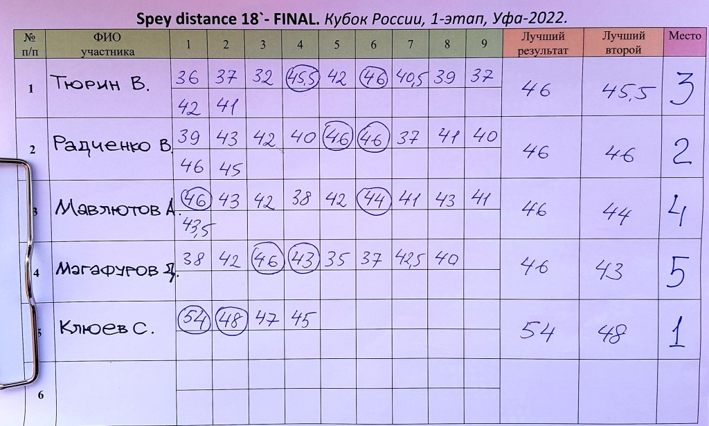 В фи6ал Trout Distance вышли: Тюрин Вадим 31.5м; Магафуров Дамир 31м; Бронников Андрей 30 5м; Мавлютов Анвар 29 5м; Черняк Сергей 29м.