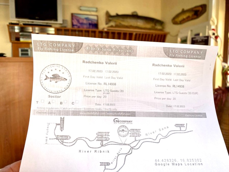 Лицензия на Рибнике и Сане действует единая, но не дешевая — 20 евро на человека в день. Для сравнения — за очень приличный домик на четверых прямо у воды мы платили 50 евро в сутки. И это прямо во Fly Fishing Center. Уверен что в окресностях можно найти жилье и дешевле. А вот лицензии наверняка только в Центре продаются.