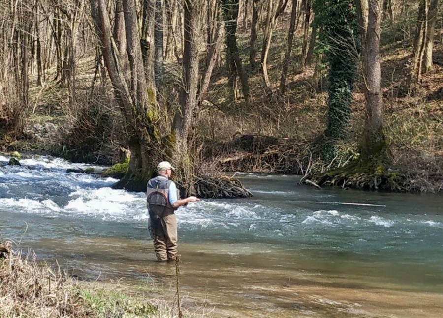 Следующая моя встреча с Ненадом и Млавой состоялась уже после снятия нерестового запрета (1 марта) и снижения уровня воды после фазы активного таяния снегов — 11 марта 2023. На улице относительно холодно — плюс 7 градусов (за день до этого и через пару дней после +15), пасмурно. Накануне прошел дождь, снег в горах тает. Вода высоковатая и мутноватая, хорошо что не настолько как в декабре.